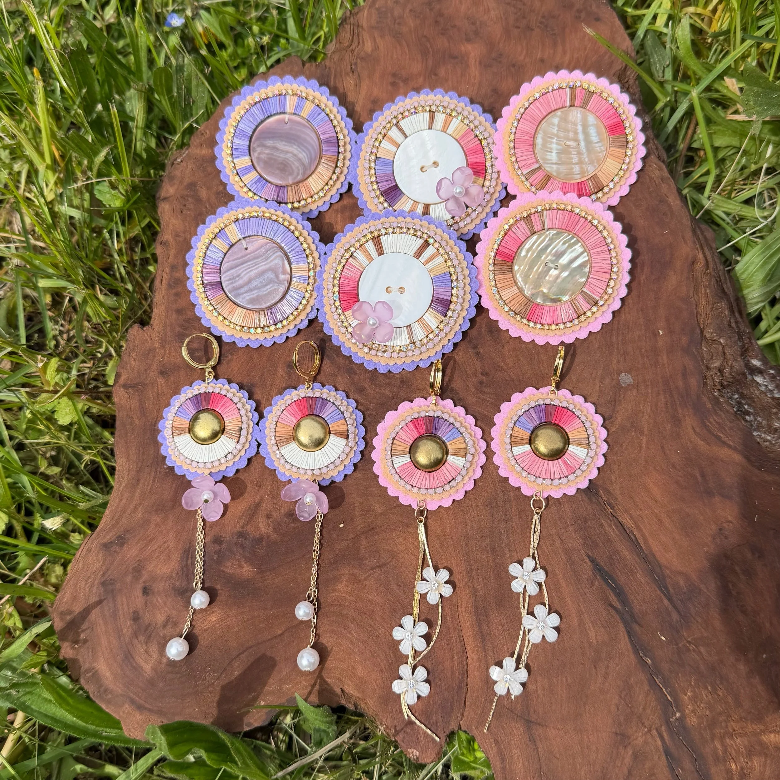 A soft purple base fades into earthy tones, carrying depth and movement like a quiet current. The wampum center anchors the piece with tradition, while rhinestone banding adds a gentle sparkle. Rooted yet flowing.